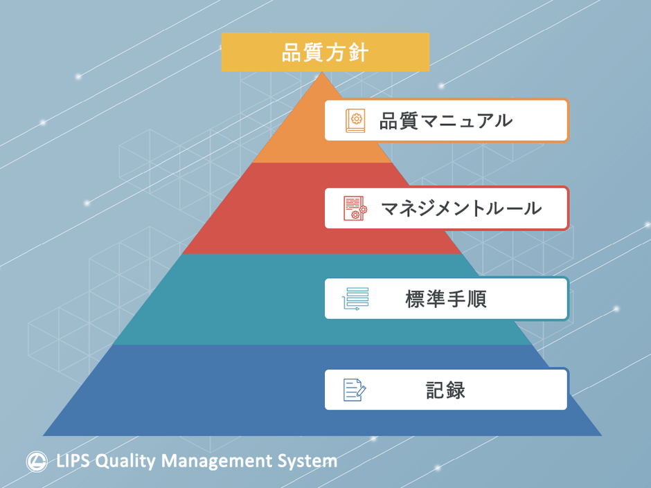 LQMSとは、明確化、文書化された品質規定(マニュアル)の下マネジメントルールや標準化された作業手順に則り運用され、日々の業務で得られる記録を分析し、改善していくことで、さらに効率的かつ効果的なものとする「成長システム」になっています。(下図参照)