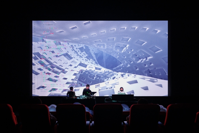 また、ライブコーディングVJとの共演が今回初となるパソコン音楽クラブの2人は、「昨日のリハーサルで、Renardさんが楽器を演奏するようにキーボードを触り、音楽に合わせてどんどん映像を変えていくのを見て、本当に一緒にセッションしている感覚になって。今日がすごく楽しみです(西山真登氏)」「映画館では映像がめちゃくちゃ鮮明に映し出される。クラブなどでは滅多に実現できないことなので、とても惹き込まれると思います(柴田碧氏)」と、観客の期待を盛り上げました。