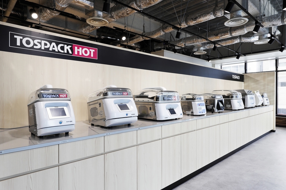 同じ品川区内にあった今までのショールームより更に製品に直に触れていただきやすい場所として、また、今後の商談オンライン化に向けてインテリジェントビルへ移転したもので、延べ床面積は約313m2と今までのショールームより拡張しております。主力のコインランドリー機器、真空包装機器の展示も行うことでお客様への製品提案だけではなく、ソリューションも含めた企画提案をいたします。その他、各種展示会やオンラインを含めたセミナーの開催・商談・製品デモスペースとして活用してまいります。