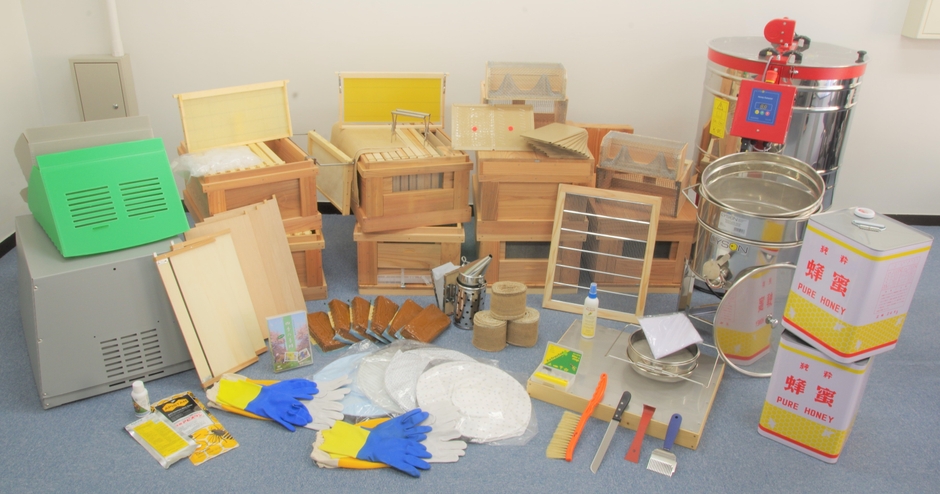 遠心分離器(遠心力の原理で巣から蜂蜜を採取する)、はちみつタンク、燻煙器(煙で蜂をおとなしくさせる。巣の手入れに必須)、養蜂着、面布(蜂刺されを防御)