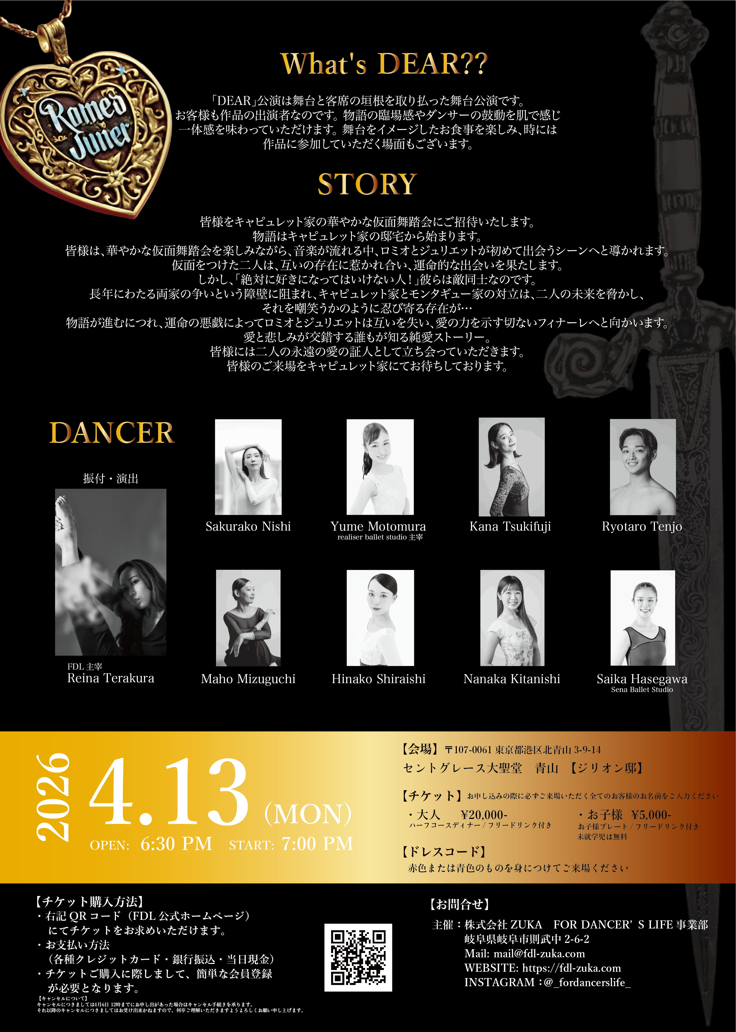 FOR DANCER'S LIFE(フォー ダンサーズ ライフ)(株式会社ZUKA、代表取締役:寺倉 修)は、イマーシブバレエ公演『DEAR 2026 Romeo & Juliet』を、2026年4月13日(月)、東京・青山セントグレース大聖堂にて開催いたします。本公演は、名作《ロミオとジュリエット》を題材にした公演で、ダンサーと至近距離で視線を交わし、鼓動や感情の揺らぎを肌で感じながら、バンケットフロアからチャペルへと空間を移動し物語を追体験していただきます。さらに、舞台をイメージしたハーフコースディナーをお楽しみいただきながら、視覚・聴覚だけでなく五感で没入する一夜限りの特別体験をお届けします。FOR DANCER'S LIFEとしては東京初開催となります。