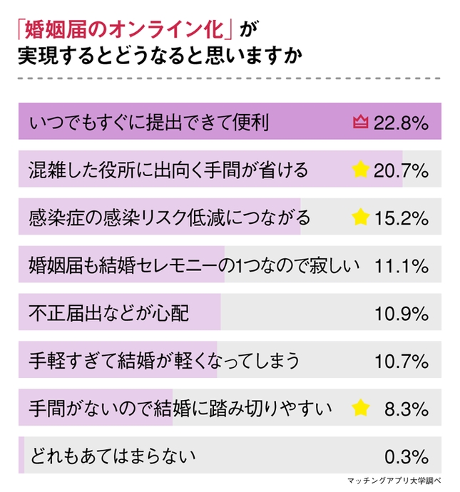 また今回のアンケートでは、「婚姻届の提出がなくなってしまうのは寂しい」という意見もかなりありました。カップルそれぞれのニーズに合わせて、役所に行って提出する方法と、オンライン提出の方法と選べるようになるといいですね。