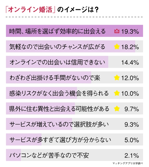 オンライン婚活に肯定的な意見が多い一方で、「オンラインでの出会いは信用できない」(14.1%)といった否定的な意見もあります。