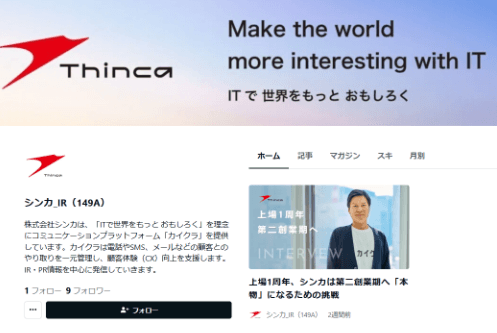 これらの発信を通じて、当社の経営姿勢や事業活動に対する理解を深めていただくとともに、企業価値向上を目指してまいります。また、企業の枠を超えた共創IRで投資家にIR記事を届ける「IR noteマガジン」にもあわせて参画いたしましたので、お知らせいたします。