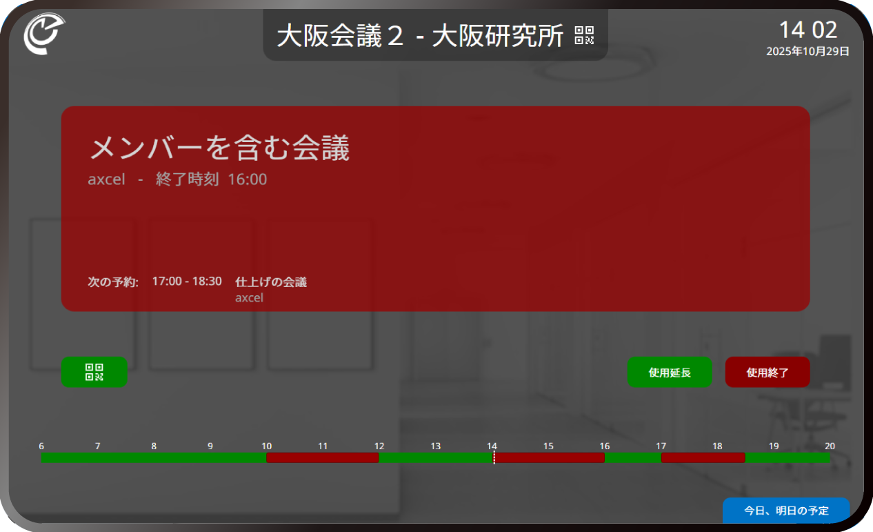 OnTime Mobileクライアント連携では、OnTime Rooms端末上のQRをOnTime Mobileクライアントで読むことで、会議延長、会議早期終了、新規会議予約などもOnTime Mobileクライアントで操作が可能となります。