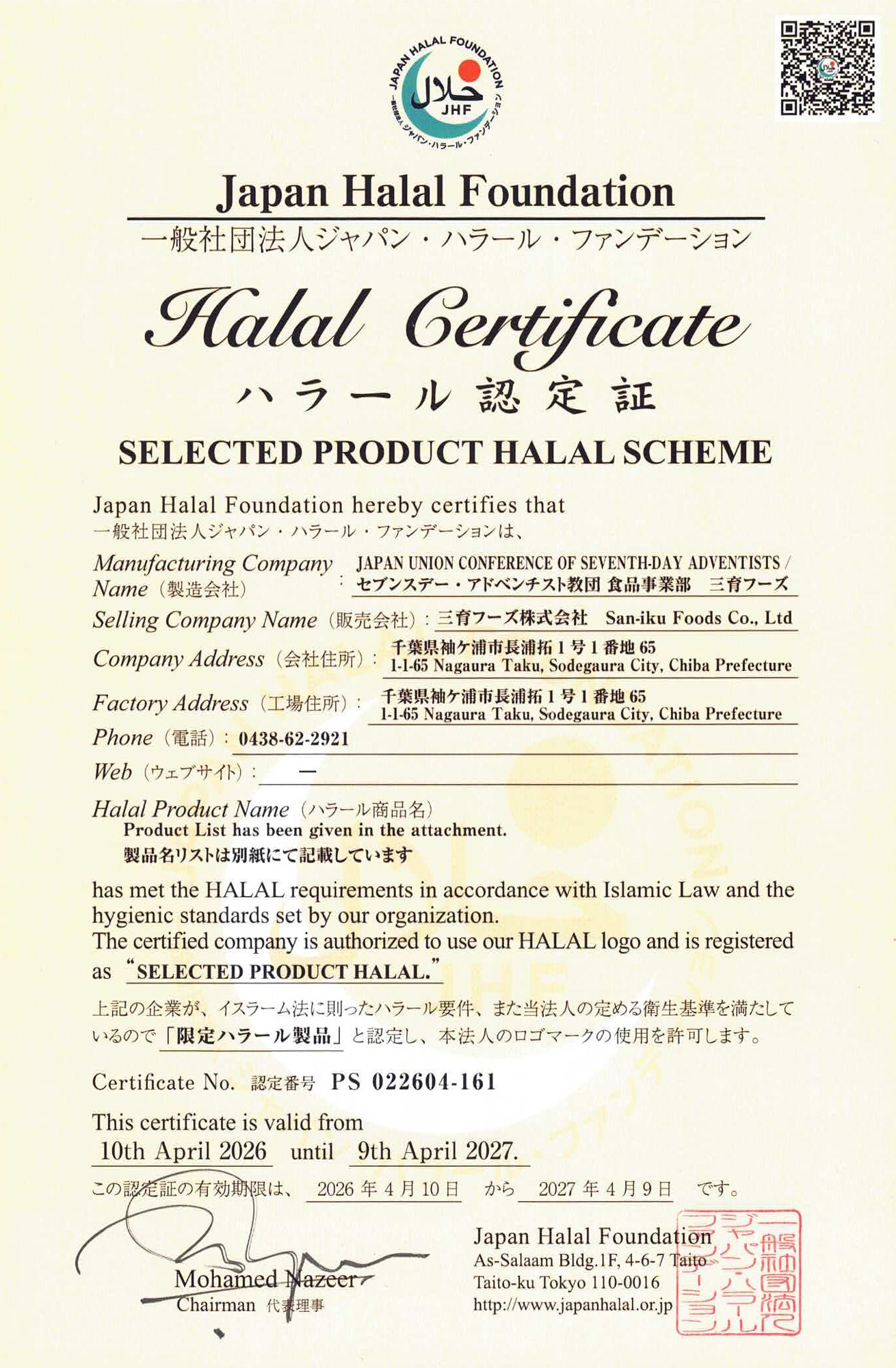 ◎認証機関: 一般社団法人ジャパン・ハラール・ファンデーション(Japan Halal Foundation / JHF)