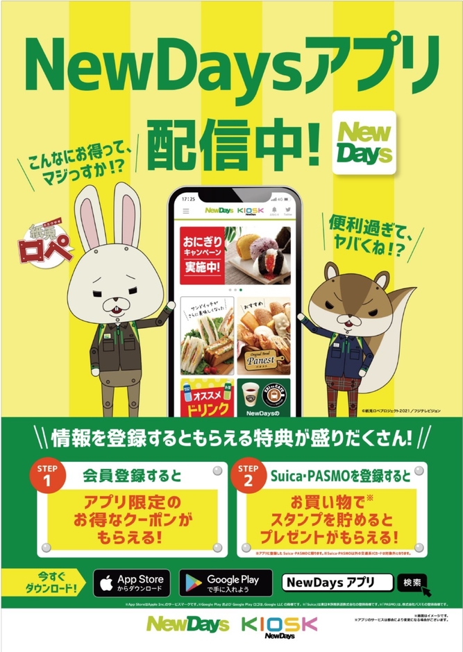 NewDaysアプリをより身近に感じていただくため、フジテレビ系列「めざましテレビ」にて放送中のアニメ『紙兎ロペ』の登場キャラクター、紙兎「ロペ」と紙リス「アキラ先輩」をPRキャラクターに起用しました。