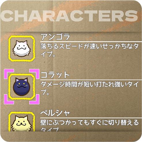 プレイキャラクター「タマネコ」は、プレイを進めるごとに増えていきます。それぞれのタマネコごとに特徴が異なるので、有利に攻略できる場合も。