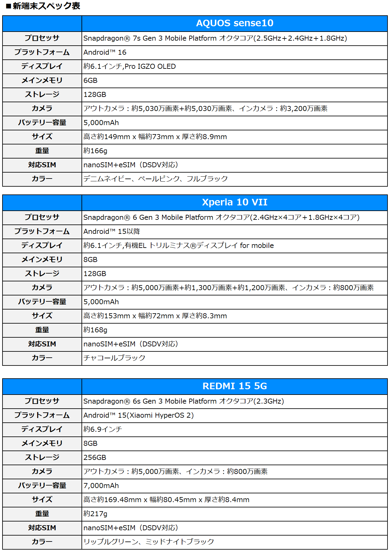 ビッグローブ株式会社(本社:東京都品川区、代表取締役社長:山田 靖久、以下 BIGLOBE)は、モバイルサービス「BIGLOBEモバイル」において、シャープ製スマートフォン「AQUOS sense10」、ソニー製スマートフォン「Xperia 10 VII」、Xiaomi製スマートフォン「REDMI 15 5G」の提供を2025年12月22日より開始いたします(注1)。