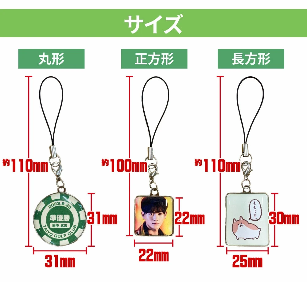 チャームの形は、丸型・正方形・長方形からお選びいただけます。