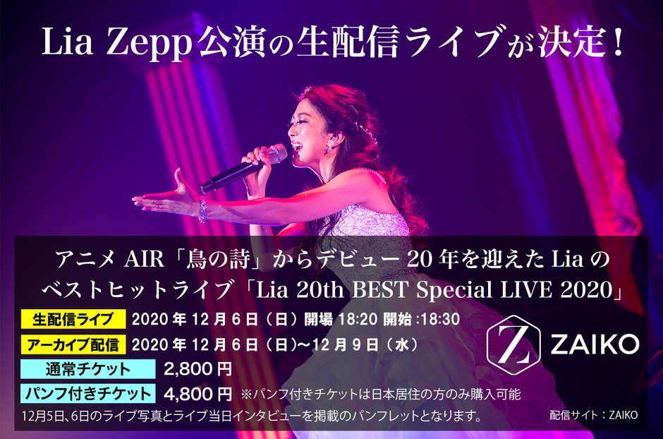 アニメ「AIR」の「鳥の詩」から歌手人生をスタートさせ、その後「CLANNAD ~AFTER STORY~」「Angel Beats!」「メカクシティアクターズ」「Charlotte」などの人気アニメや劇場版「planetarian ~星の人~」の主題歌で知られるLiaがデビュー20周年を記念し、ベスト盤「Lia 20th BEST」を2020年11月25日に発売しました。また、キャリア初となるBlu-ray作品も同日発売となり、その発売を記念したベストヒットライブ「Lia 20th BEST Special LIVE 2020」が2020年12月5日、6日の2日間開催され、12月6日公演の模様の生配信ライブが決定しました。