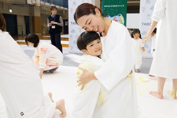 当日は、事前抽選で選ばれた12組(25名)の親子が参加しました。イベントの始めには、TABOTENZUブランド責任者が新商品とブランドへの想いを語りました。説明後には、TABOTENZUの新商品「かぞくのおえかきウェア」をご家族に着用いただき、えのぐあそびがスタート。 体育館いっぱいに広げられた模造紙や、1mのサボテン型ダンボール、そして子どもとおとながお互いのウェアに「ゆびえのぐ」をつけあいながら、汚れることを気にせず親子で思いきり“えのぐあそび”を楽しむ様子が見られました。 えのぐを指で混ぜたり、えのぐの付いた手でハグをしあって、親子で笑い合いながら、ウェアに思い出を残すシーンもございました。