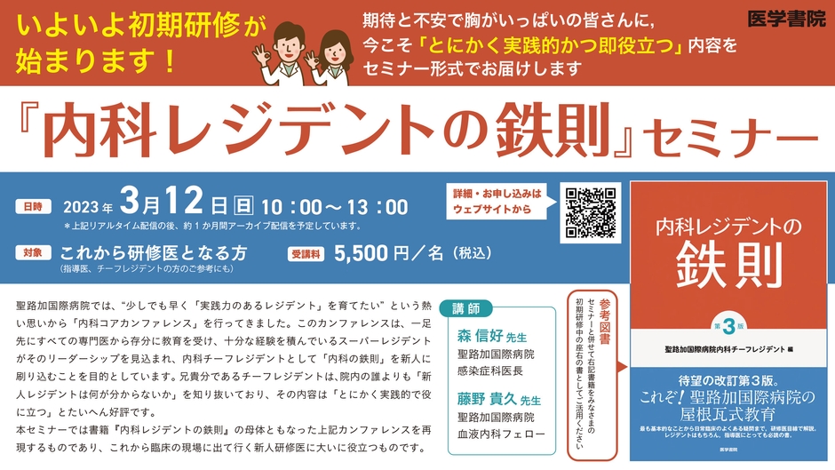 株式会社医学書院(所在地:東京都文京区、代表取締役社長:金原 俊)は、春から研修医となる医学生向けに「『内科レジデントの鉄則』セミナー」(講師:森 信好先生/聖路加国際病院感染症科医長、藤野 貴久先生/聖路加国際病院血液内科フェロー)を2023年3月12日(日)10:00~13:00にオンラインで開催します。