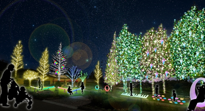 「煌めく虫たちのエントランス」では、色とりどりのイルミネーションの中に生息するカブトムシやカマキリなど巨大な「ロボット昆虫」がお出迎え。光り輝くメタセコイアの街路樹に囲まれた「輝きのプレイ広場」は、光るブランコやシーソーのほか、鍵盤や円形のライトを踏むと色が変わったり、音が鳴る仕掛けなど光と音のコラボレーションをお楽しみいただけます。イルミネーションで覆われた70メートルの「光の道」は、写真スポットにお薦めです。大人からお子様まで、園内を散策しながら幻想的なイルミネーションをお楽しみいただけます。