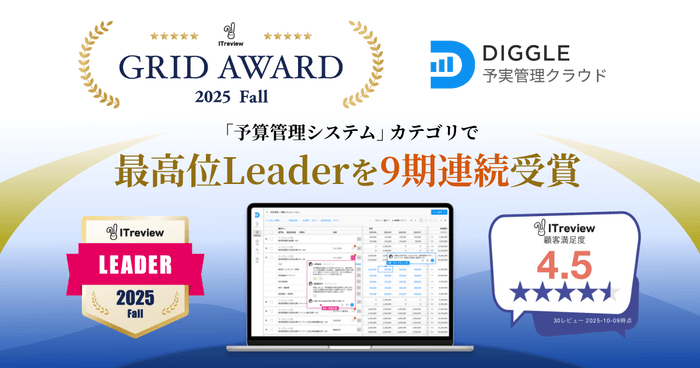 経営資源の戦略的な投資判断を支える経営管理プラットフォーム「DIGGLE」が、ITreview Grid Award 2025 Fallにて、「予算管理システム」カテゴリで最高位の「Leader」を9期連続受賞