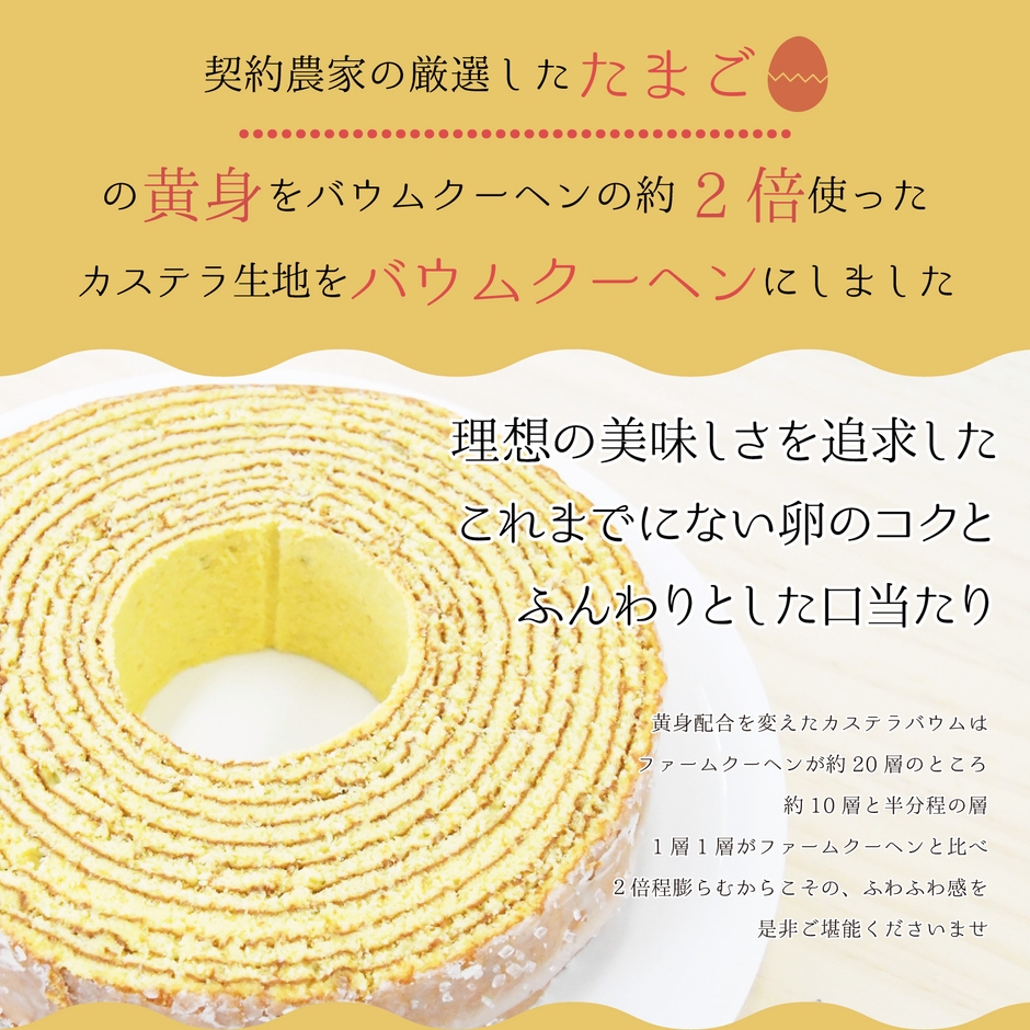 理想のバウムクーヘン型のカステラを追求した結果、通常のバウムクーヘンの約2倍以上の黄身を使用し、1層1層は2倍程にふっくらと仕上がりました。