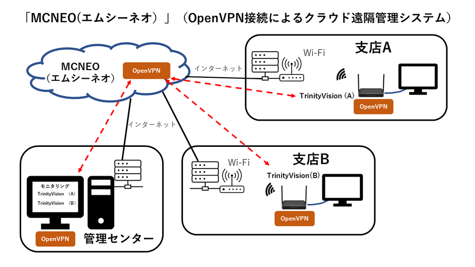 エムシーネオとは、“Manageable Cloud Network Endpoint with OpenVPN”の略で、インターネットにつないだネットワーク機器(Network Endpoint)と管理用クラウドとをOpenVPN*注(オープンソースの仮想プライベートネットワーク)で接続し、機器設定などのモニタリングを遠隔にある管理センターからインターネット経由で行うことができるクラウド型遠隔管理システムです。