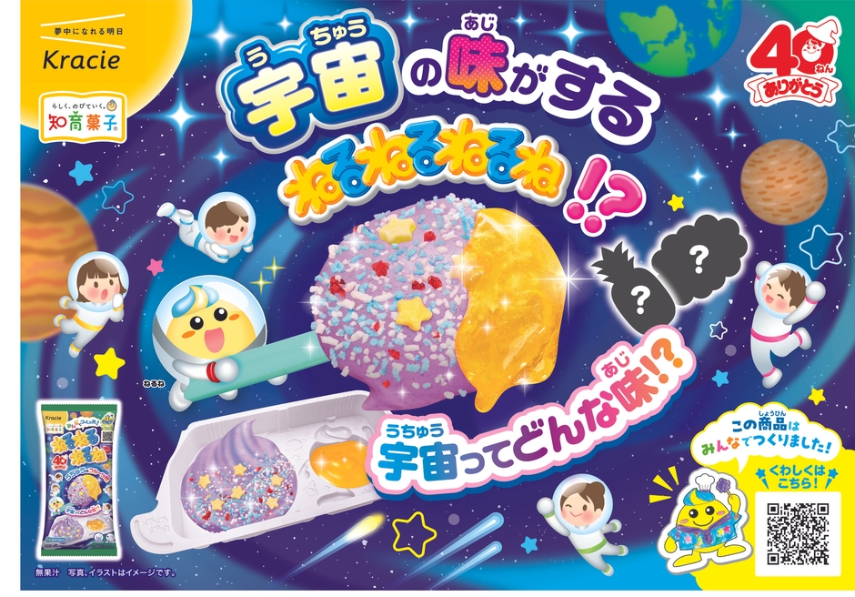 「ねるねるねるね うちゅうのフルーツ味」は、2025年に実施した参加型プロジェクト「みんなでつくるねるねるねるね」で集まった声をもとに誕生した40周年記念商品です。SNSでのフレーバー募集や子ども会議での試食、パッケージに載せるねるねのデザイン公募などを通じ、大人から子どもまで延べ数千人の想像力を掛け合わせた結果、最終的に“宇宙”というコンセプトにたどり着きました。