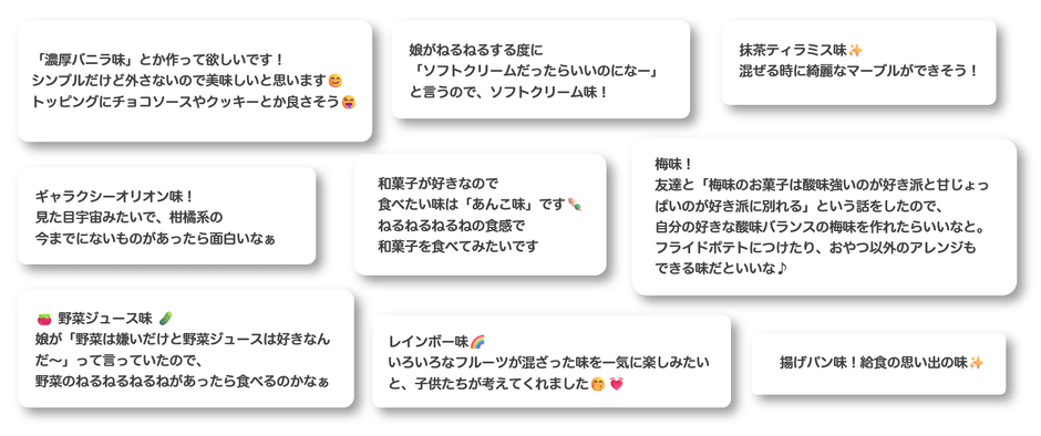 X(旧Twitter)で、フレーバーのアイディアを募集。「レモン味」や「マンゴー味」といったフルーツ系から、「杏仁豆腐味」や「みたらし団子味」などユニークなフレーバーまで、3,032件ものアイディアが寄せられました。