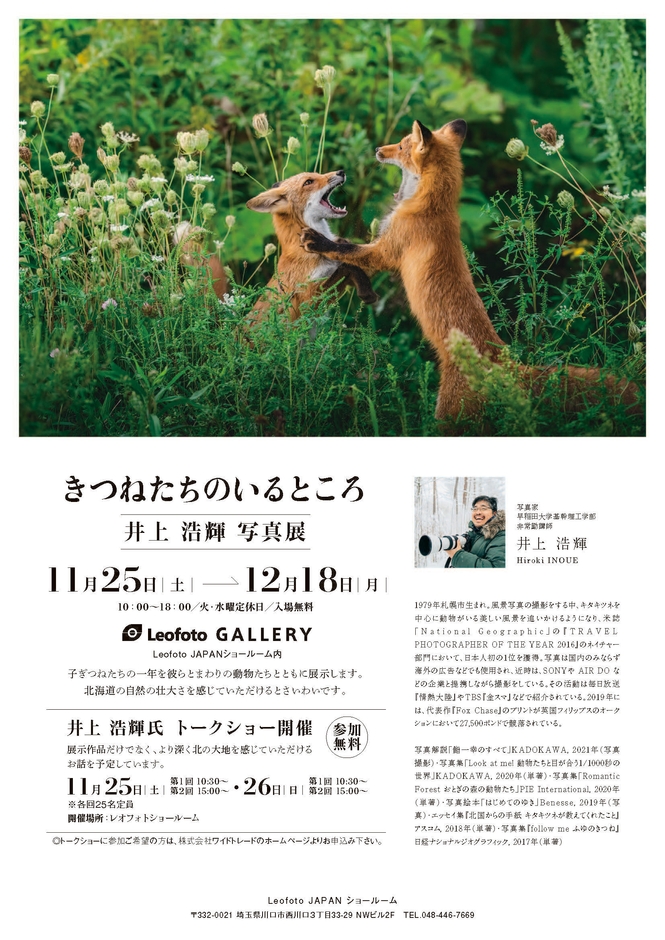 株式会社レオフォトジャパン(代表取締役:上田 晃央、埼玉県川口市南鳩ヶ谷5-17-12)は、写真家 井上浩輝の写真展「きつねたちのいるところ」を2023年11月25日(土)から12月18日(月)までレオフォトショールームにて開催いたします。