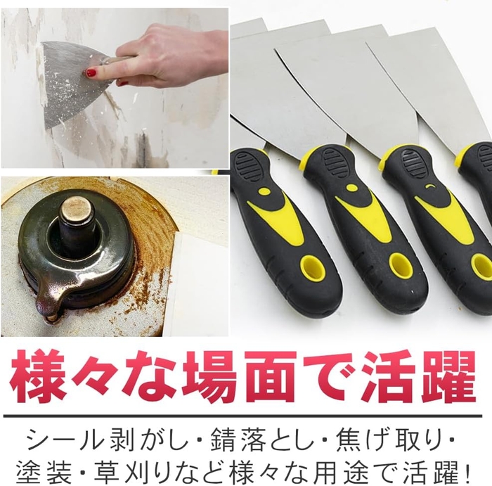 普段の掃除からリフォームやDIYまで幅広く使えるスクレーパーは、錆取り・焦げ落とし・シール剥がし・パテ塗りなど様々な用途でお使いいただける汎用性の高いアイテムです。掃除だけでなくスコップのように使うことで草刈りにも重宝します。片手だけで操作できる手軽さもポイントです。