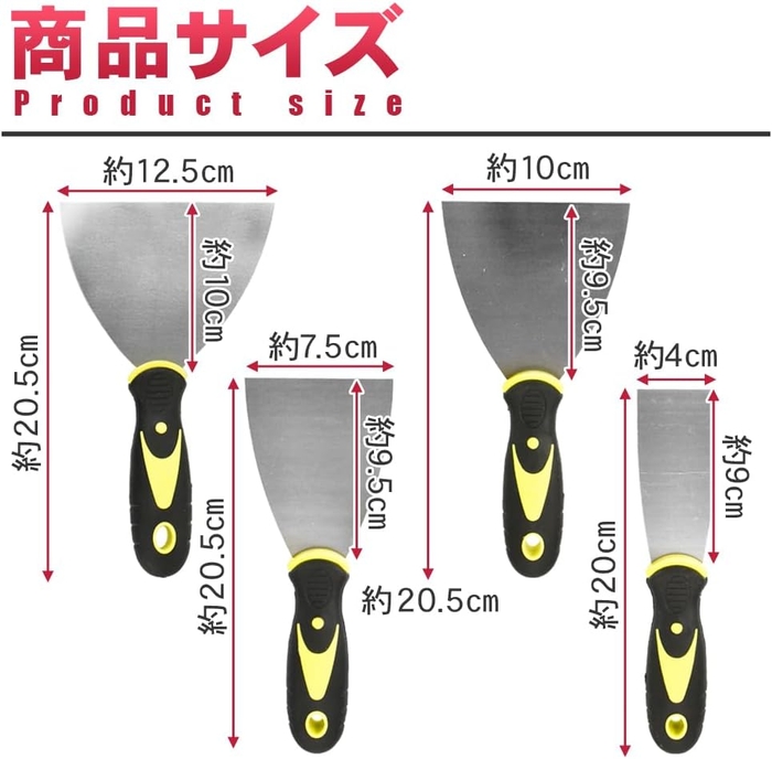 業務用としても使えるほど実用性に優れたスクレーパーは、異なる刃幅を4種類取り揃えておりあらゆる現場のニーズに応えます。持ち手にはフック穴が開いているため紐やタグを通すのはもちろん、そのままフックにかけて吊り下げることも可能です。工具箱を圧迫せず省スペースで保管できるのも嬉しいポイントです。