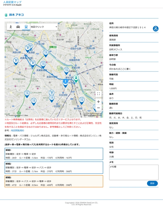 ゼンリンデータコムが提供する「人員配置マップ」に、 ジョルダンが保有する「乗換案内Biz API」を活用した [ドアtoドア検索]機能を追加