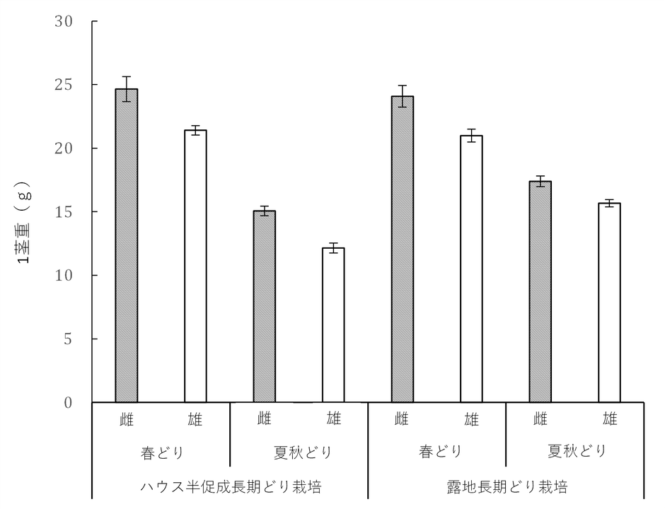 その結果、露地長期どり栽培およびハウス半促成長期どり栽培の2つの長期作型において、1茎重および収量は雌株が雄株と同等か有意に高く、雌株の利用により単価の高い太いアスパラガスの収量が増える可能性が示唆されました。