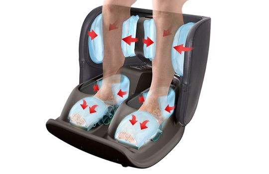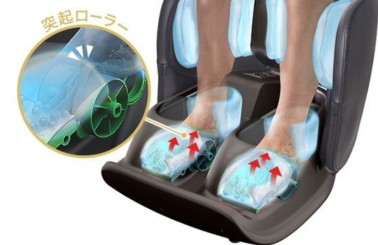 ふくらはぎをエアーバッグが横からしっかり包み込んで絞り上げ、足裏を突起のついたローラーでぐいぐい揉みほぐします
