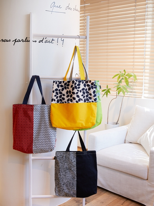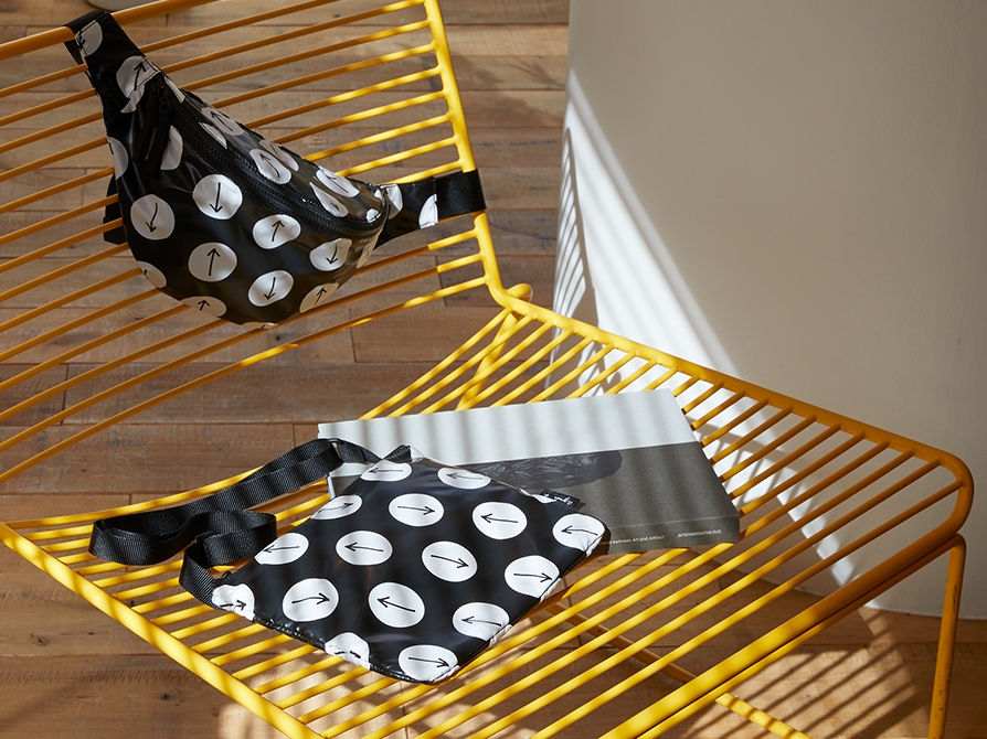 バッグラインにはリサイクルナイロンなどを使用したバックパックやウォレットが並びます。アニエスベーの洋服の余り生地をアップサイクルしたトートバッグや、アニエスベーがサポートをつづける海洋科学探査船タラ号のシルエットをプリントした、海洋プラスチックごみをリサイクルしてつくられた素材を使ったバッグもラインアップ。