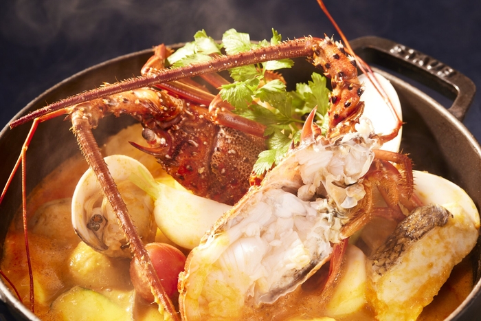 漁の後は獲れたてのイセエビを使って、港で海鮮バーべキューをします。まるごと焼いたイセエビは、レモン塩、あおさ塩、ウニのソースなどさまざまな調味料で、自分好みにアレンジして味わえます。さらに、殻やミソを活用したブイヤベースを作り、お米とチーズを入れて完成した濃厚なリゾットは、イセエビを余すことなく堪能できる贅沢な朝食です。