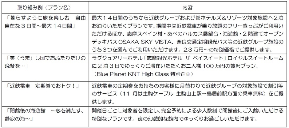 旅行期間を3・6・9・12・14日間からお選びいただき、期間内に近鉄グループおよび都ホテルズ&リゾーツ対象施設で2泊お泊りいただくプランです。旅行期間内は、近鉄電車が乗り放題のフリーきっぷがご利用いただけるほか、志摩スペイン村(※)・あべのハルカス展望台・海遊館・2階建てオープンデッキバスOSAKA SKY VISTA、奈良交通定期観光バス(※)等の近鉄グループ施設のうち3つを選んでご利用いただけます。旅行期間と宿泊日・宿泊先を自由自在に組み合わせて、自由自在に近鉄沿線をお楽しみいただくことが可能です。