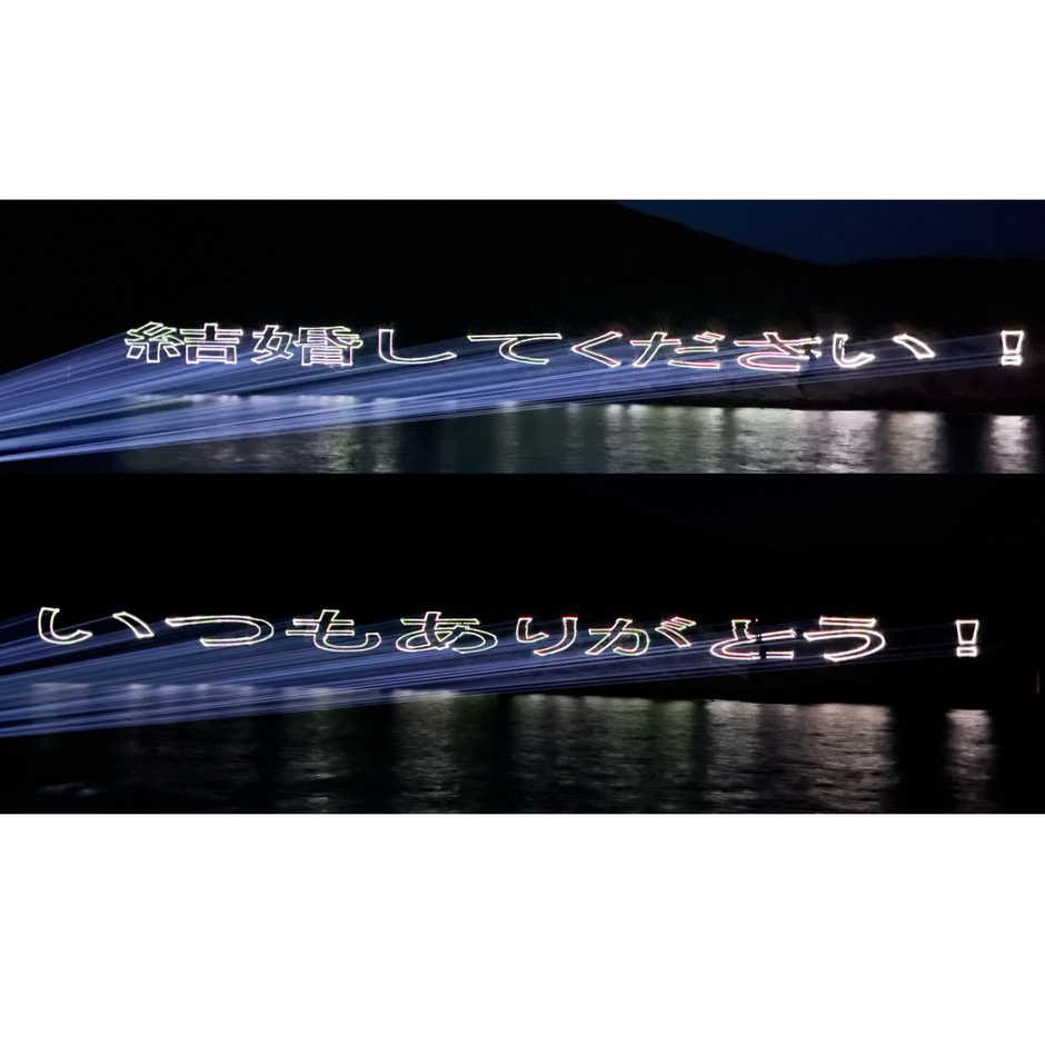 誕生日、記念日のお祝いメッセージだけではなく、夫婦、カップル間での感謝の言葉、成功率100%のプロポーズのメッセージ等が漆黒の夜空に飛び交い、感動のあまり涙するゲストもいらっしゃいます。
