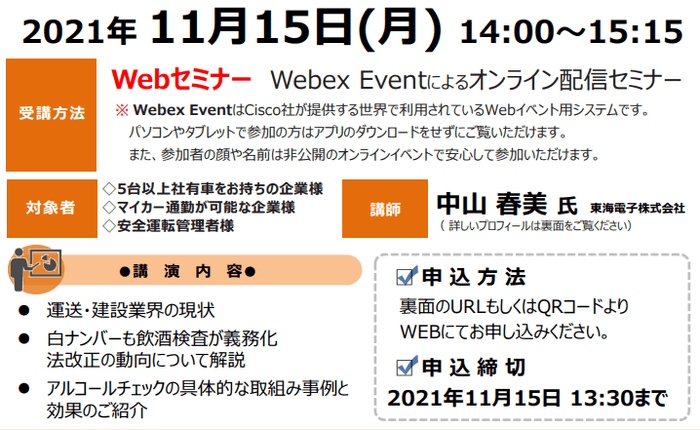 【東海電子】白ナンバー飲酒検査の義務化にそなえる!検知器だけでは防げない!アルコールチェック対策セミナー11月15日(月)開催のお知らせ