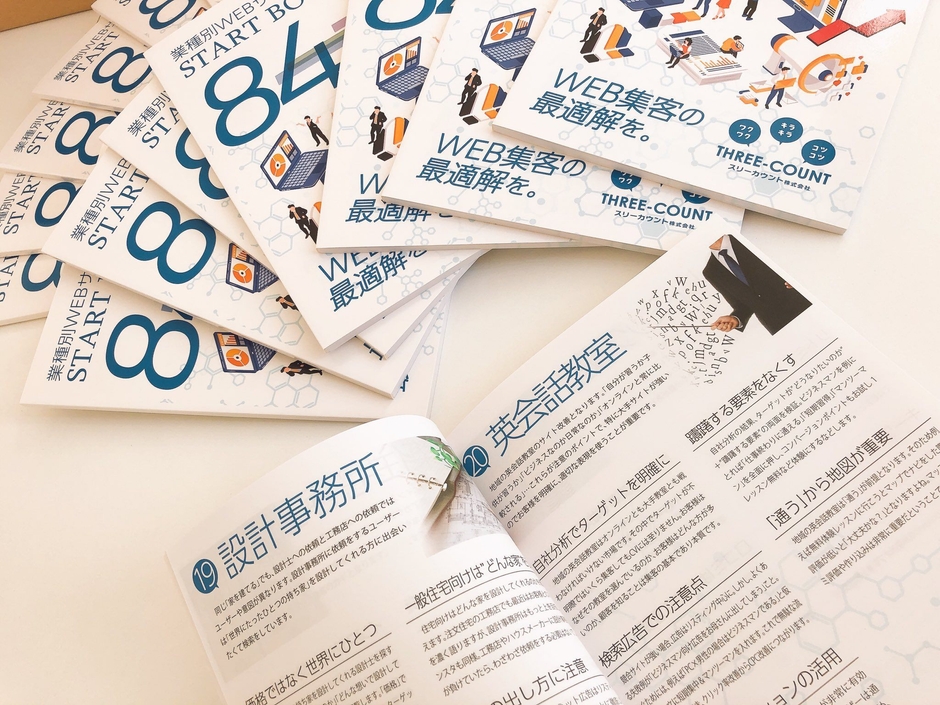 ウェブマーケティングの専門会社「スリーカウント株式会社」(本社:静岡県浜松市、TEL 0120-933-875)が無料で公開をした、84業種にわたる各業種のホームページの改善ポイントが記載された冊子「業種別WEBサイト改善 スタートブック84」が、Twitterで大きな反響をいただいております。