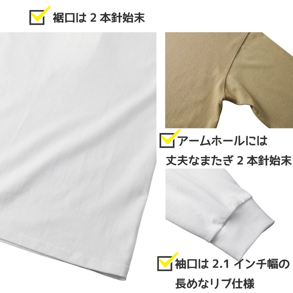 首まわりは丈夫なダブルステッチ仕上げで、長く着てもヨレにくい安心の仕様。アームホールには耐久性の高いまたぎ2本針ステッチを施し、型崩れを防ぎながらタフに着こなせます。袖口は2.1インチ幅の長めリブを採用し、ステッチを隠したミニマルなデザインで洗練された印象に。さらに裾口も2本針仕上げで、全体のバランスを引き締めています。