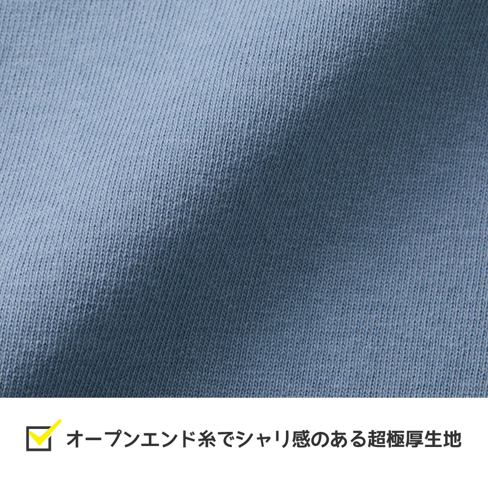 生地にはオープンエンド糸を用いたシャリ感のある超極厚素材を使用。着込むほどに味わいが増し、経年変化を楽しめるタフで存在感のある質感が魅力です。