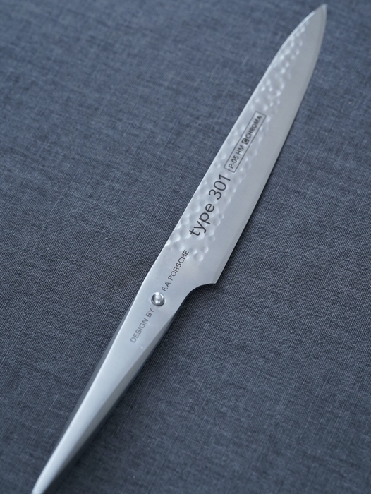 日本市場に出回っているナイフのほとんどは、耐高破断能力(刃先)が56°です。CHROMA TURBOは61°。この違いが「切れ味の違い」を生み出します。クロマ独自の「Ka-Six」精製法がこの固さを実現しました。ハンドルも独特です。人間工学に基づいたデザインにより手の負担を減らしました。ナイフ本体の重みを活かし少ない力でサクサク切れる「魔法の使い心地」を実現しています。