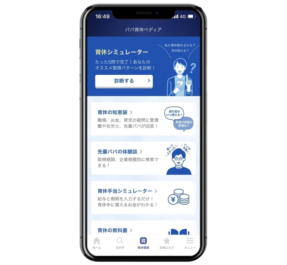 育休の基本が学べる「育休の教科書」、専門家や先輩パパたちに質問できる 「育休の知恵袋」、先輩パパの体験談や育休シミュレーターなど、 育休の不安を解消するコンテンツが満載!