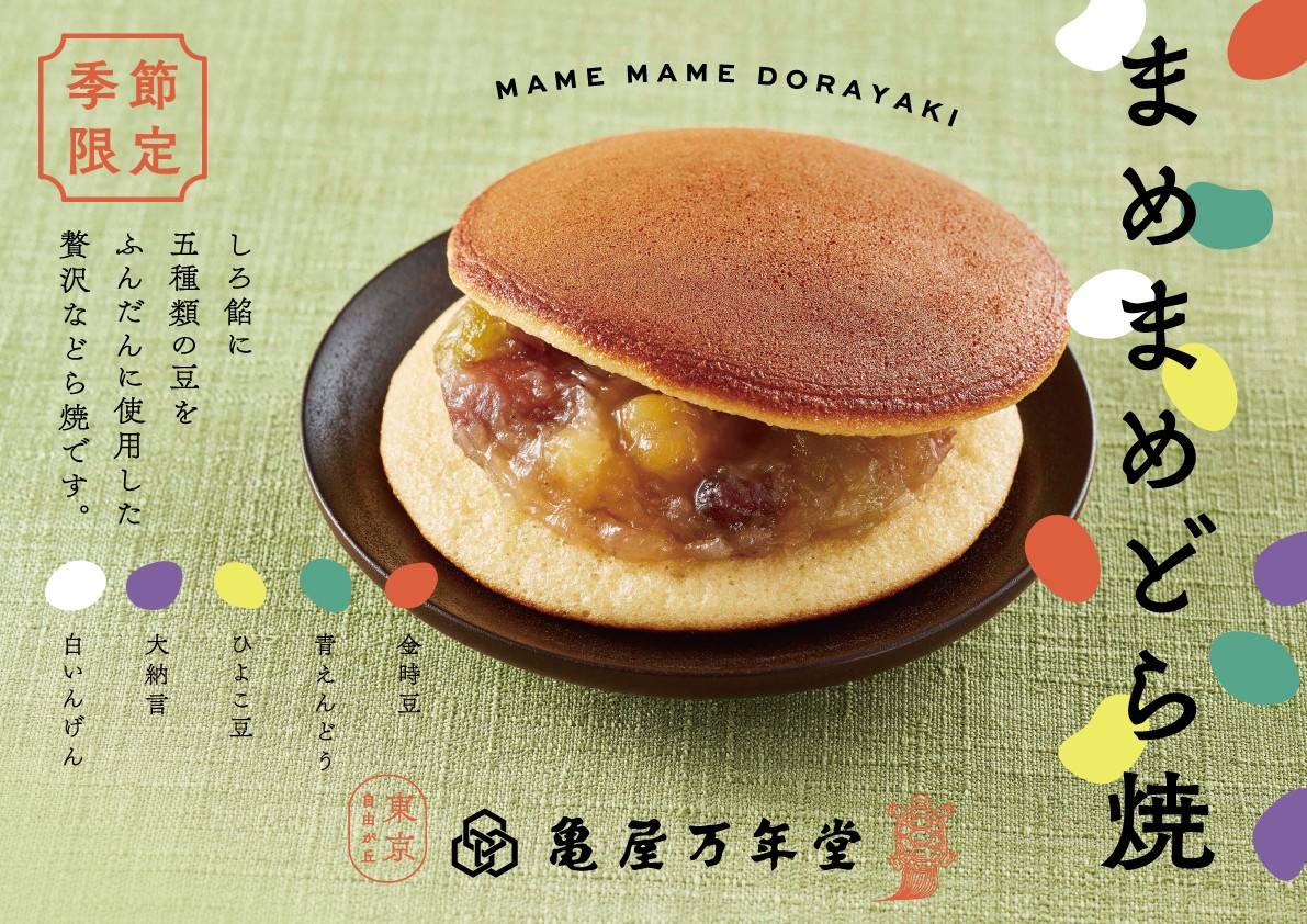 株式会社亀屋万年堂(本社・工場:神奈川県横浜市都筑区 / 総本店:東京都目黒区自由が丘)は、節分にちなみ5種類の豆を使用した、この時期だけの『まめまめどら焼』( 1個216円(税込)・常温販売・季節限定 )を、亀屋万年堂直販店舗(東京・神奈川17店舗)及び公式オンラインショップにて好評販売中です。