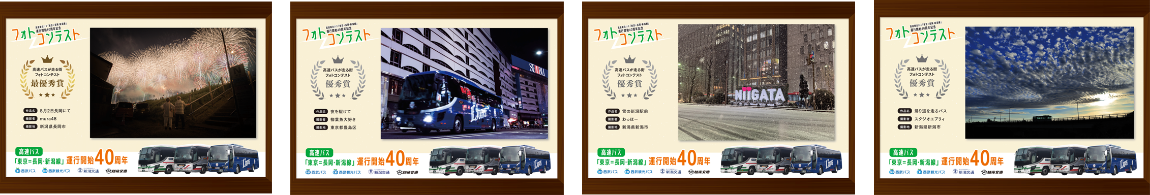 本コンテストは、4社共同運行の高速乗合バス「東京=長岡・新潟線」が運行開始40周年を迎えることを記念し、「高速バスが走る街」をテーマに、地域の活性化につながる魅力の発信を目的として開催したもので、バスを撮影した写真に限らず、路線の停留所がある市町村の風土を感じる建築物や風景、伝統行事など幅広く作品を募集いたしました。今回、応募があった合計247件の作品の中から厳正な審査を経て、特に優れた作品を最優秀賞・優秀賞・各社賞として選定しました。受賞作品は、本日以降、西武バス・新潟交通・越後交通の路線バス車内にポスターとして掲出するほか、各社賞を含む計8作品を使用したチラシを営業所・案内所等で配布いたします。
