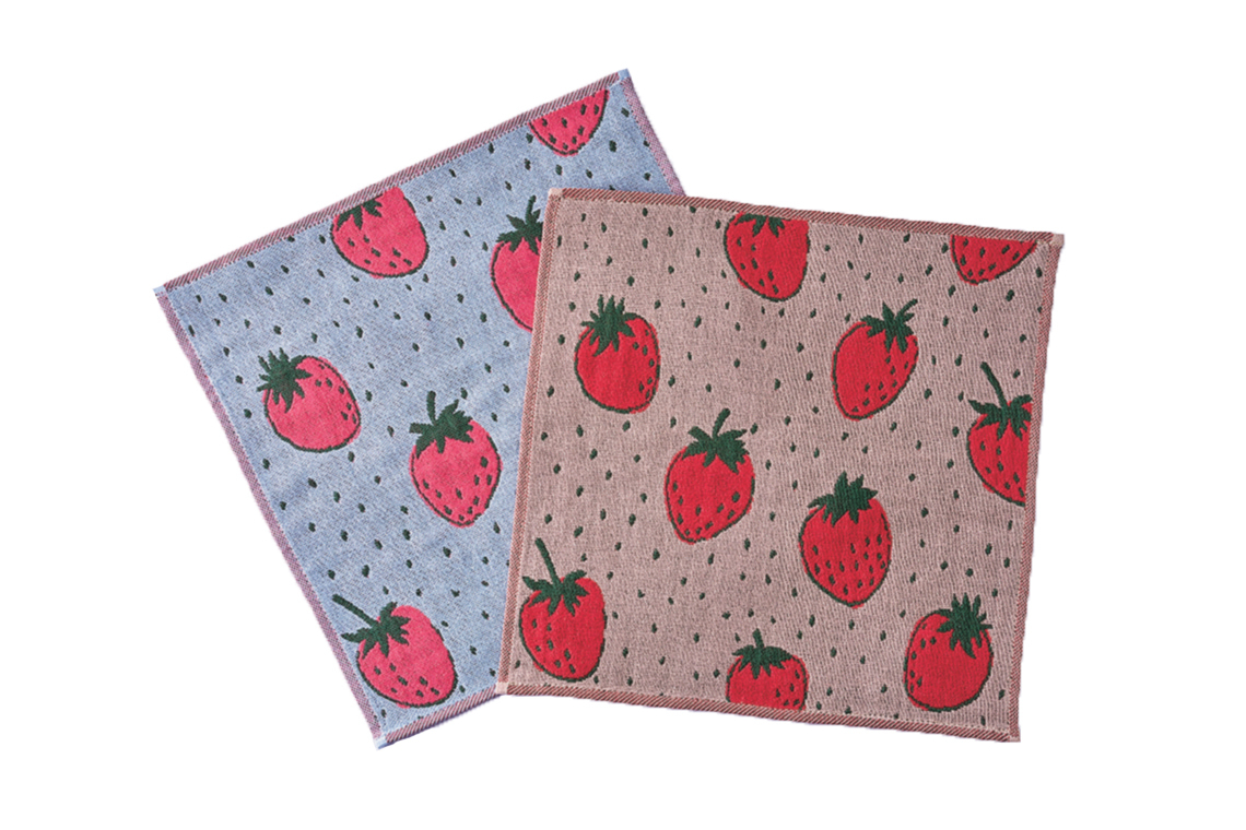 フィンランドの森いちごを描いた柔らかなガーゼ素材のハンカチ。