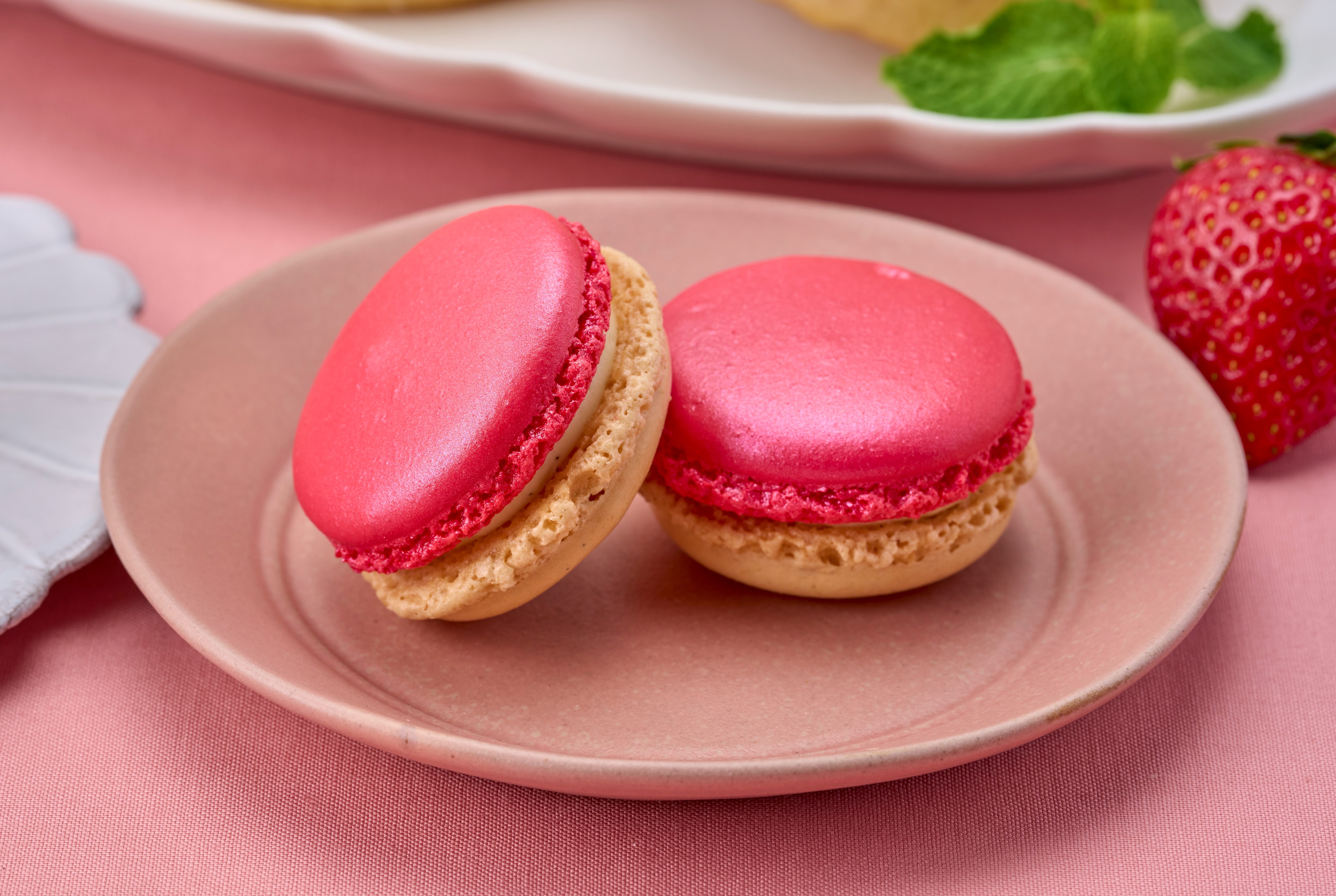 ホワイトチョコクリームにいちごのコンポテを忍ばせた生マカロン。