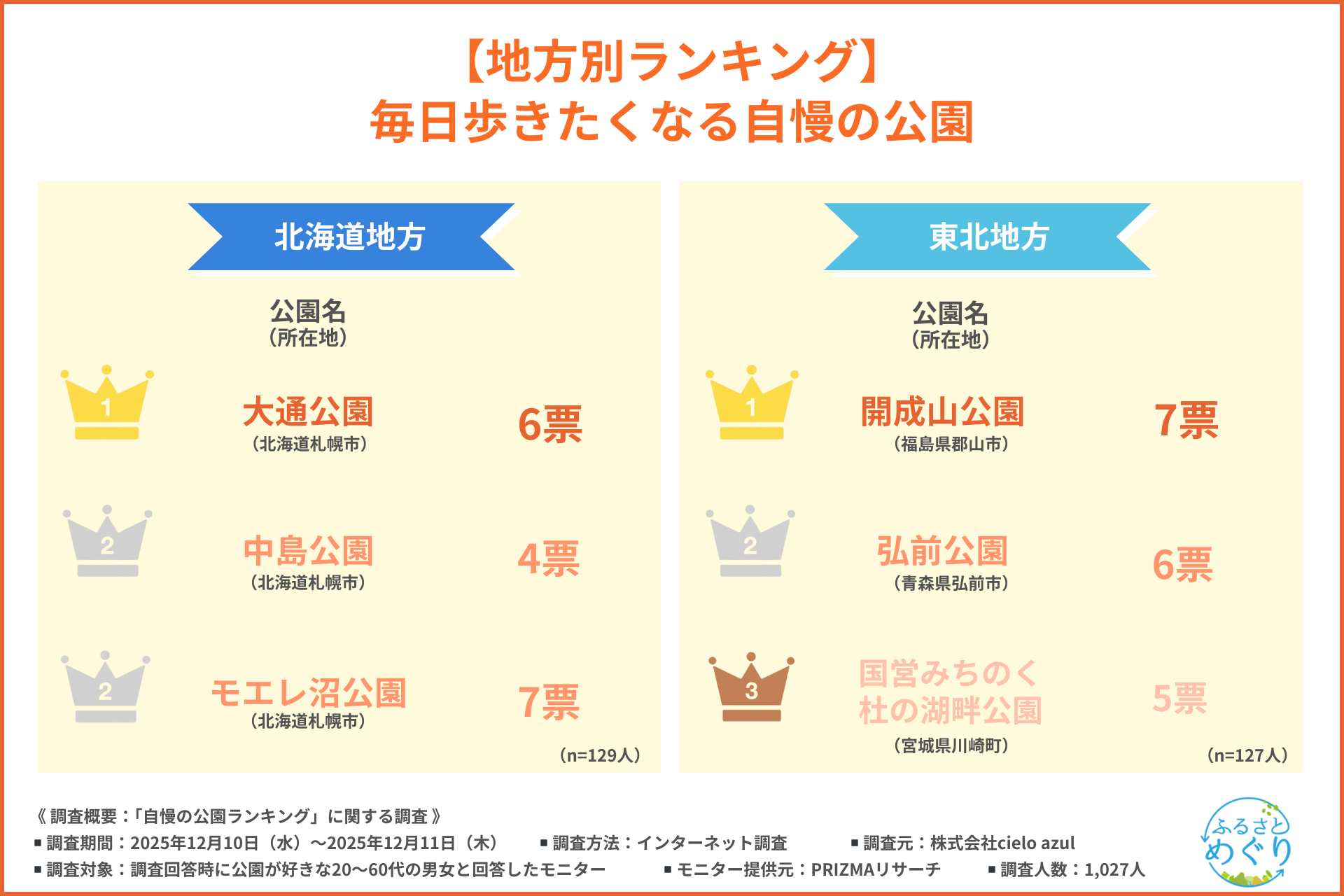 暮らし密着メディア『ふるさとめぐり』が「大通公園」「国営昭和記念公園」「大濠公園」など地方別1位を発表、散歩・ウォーキング目的58.9%/住まい選びで「良い公園」重視は約8割の結果を公開しました。