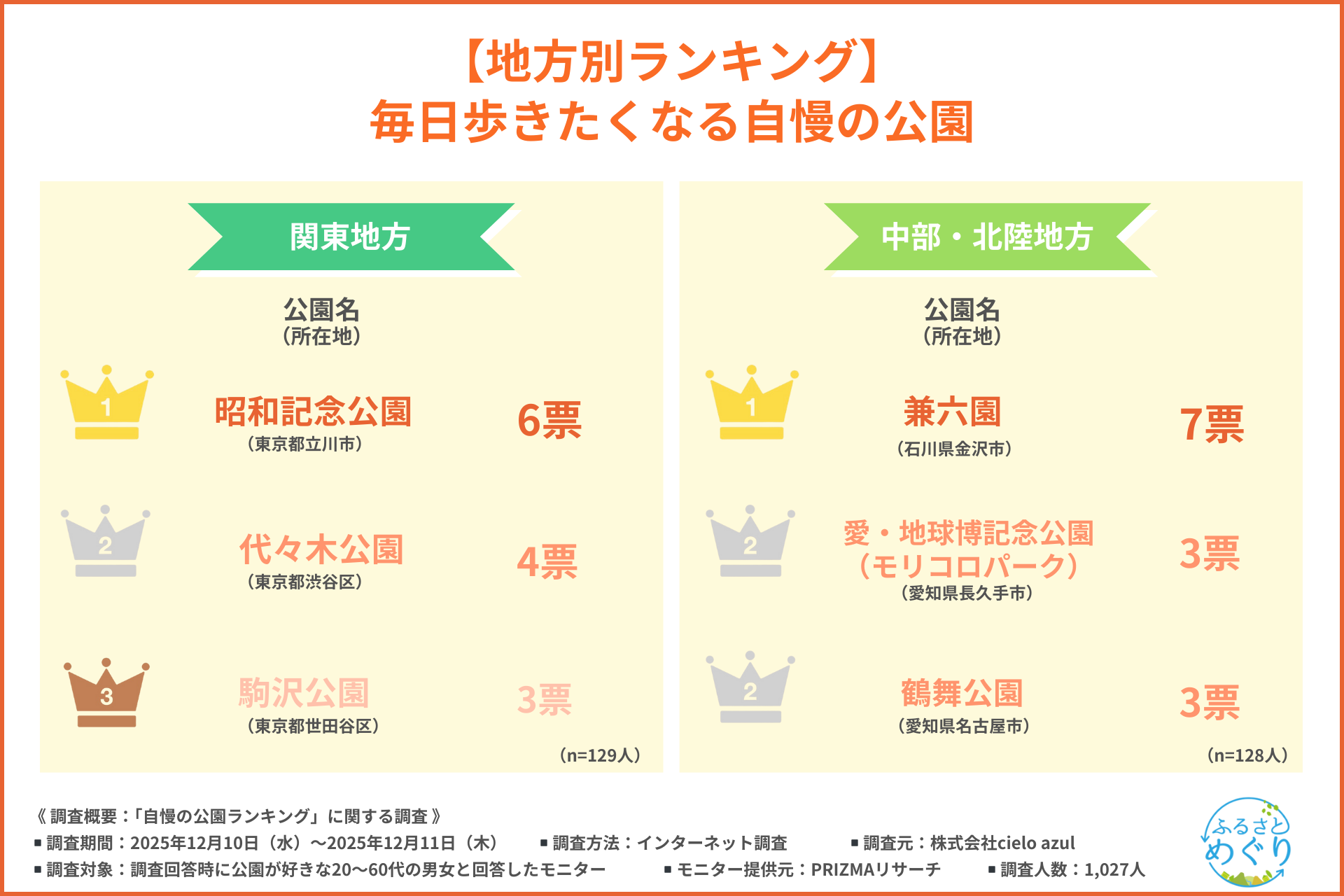 「毎日歩きたくなる公園」地方別ランキングを公開(公園好き1,027人調査)
