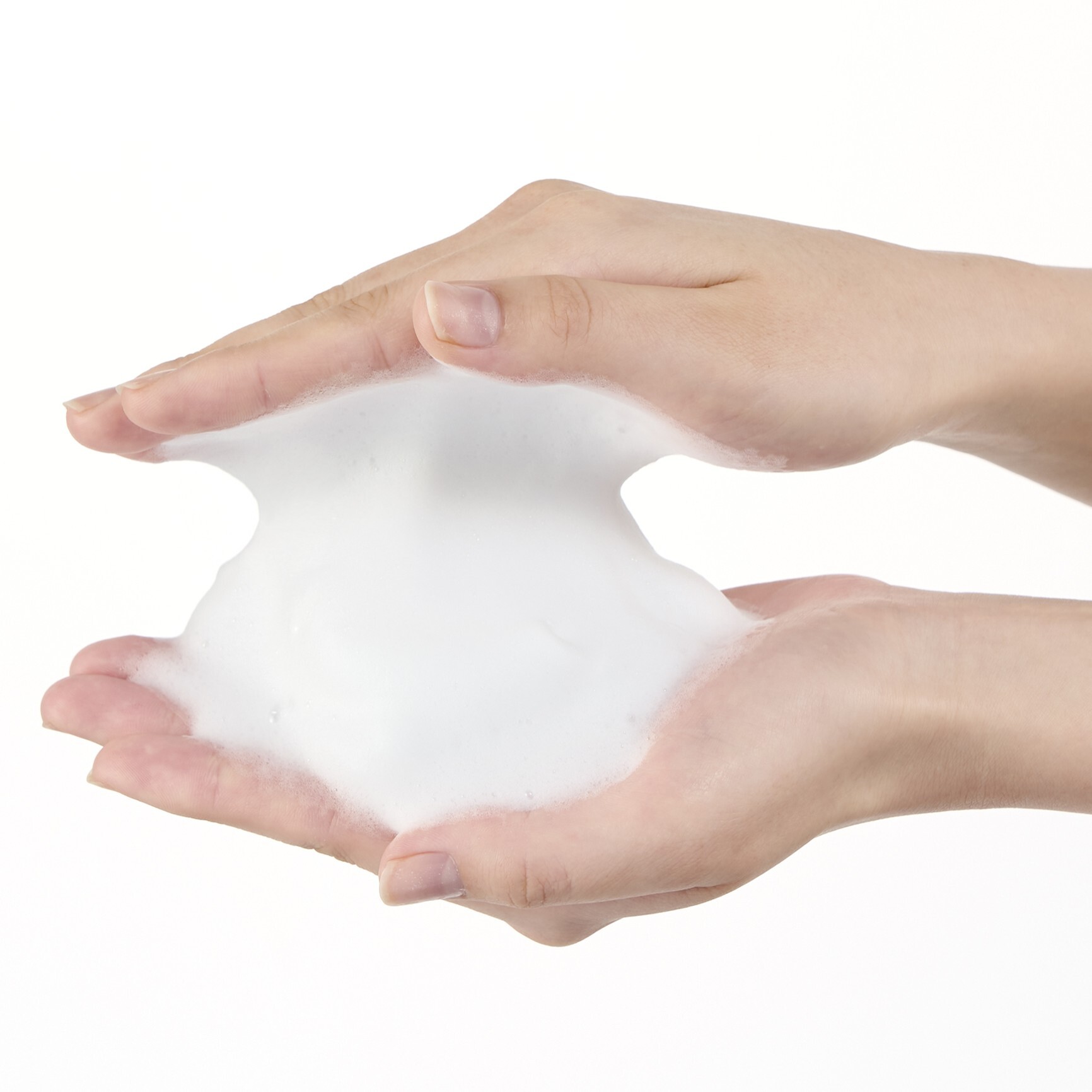 顔をぬらした後、1回分(1~2cm)を手に取り、水またはぬるま湯少量を加え、よく泡立てます。泡で顔を包むように全体をやさしく洗います。