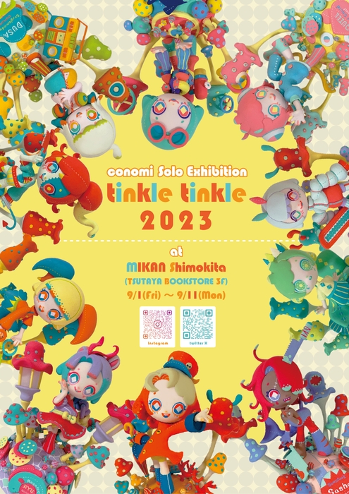TSUTAYA店舗や書店で取り扱うエンタテイメント商品の商物流事業会社、株式会社MPD(本社:東京都千代田区、代表取締役社長 長 豊光、以下MPD)は9月1日(金)よりTSUTAYA BOOKSTORE下北沢 3F草叢スペースにて、カラフルでポップな色使いのカワイイフィギュアたちを次々と生み出すconomiさんの個展『tinkle tinkle 2023』を開催いたします!