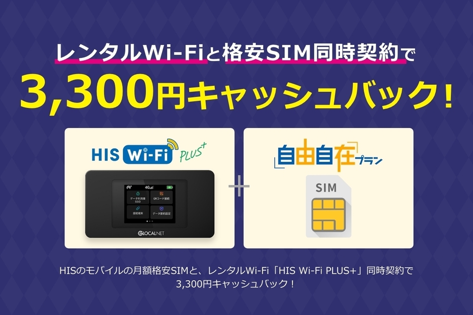 キャンペーン期間中、レンタルWi-Fi「HIS Wi-Fi PLUS+」と格安SIM「自由自在プラン」の両方をお申込み・ご成約いただき、専用エントリーフォームよりお申込みいただくと、3,300円をキャッシュバックいたします。