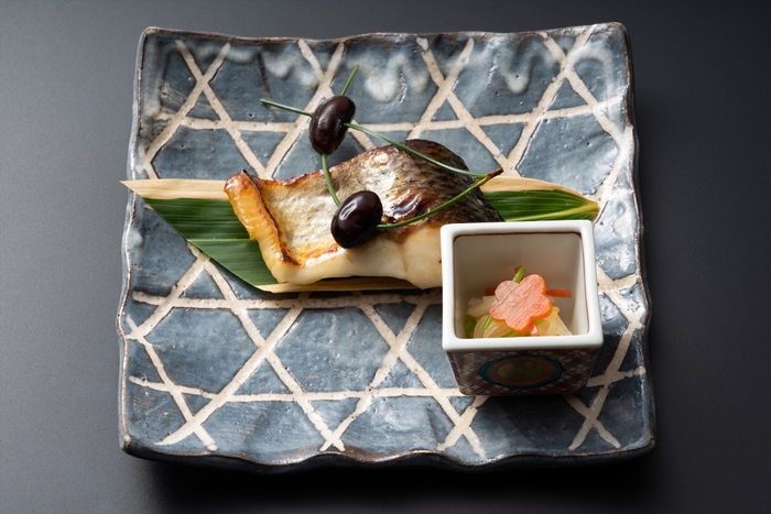 焼物は、雪のような銀白色の信濃雪鱒を幽庵地で焼き上げました。幽庵地には、ふくよかな香りの西京味噌を加えています。信濃雪鱒は冬に旬を迎える川魚で、自家製の麹(こうじ)に漬け込むことでよりふっくらと仕上がっています。
