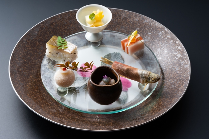 八寸は迎春の肴核と題し、新春の華やいだ風情や、木々に白雪が降り積もる嵐山の冬の情景を表現しています。器には、山茶花(さざんか)の花と葉を粉砂糖で雪化粧して添えました。木から落ちる玉雪を模した「百合根玉雪」は、裏ごした百合根生地で白あんを包み、氷餅(こおりもち)をまぶすことで雪が陽の光に反射する様子を表しています。「鮫ヶ井鱒(さめがいます)博多」は、脂がのった鮫ヶ井鱒をスモークし、聖護院蕪(しょうごいんかぶら)を合わせた蕪鮨です。スモークの香りが冬の焚火の情景を思わせます。また、旬の淡水魚である「ワカサギのフリット」をプロシュートの塩味とあわせるなど、冬の京都になじみが深い食材を星のや京都ならではの仕立てで味わうことができます。